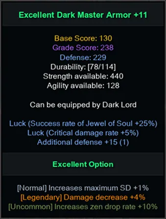 Todas as fontes de Damage Decrease (Excellent, Harmony, Socket) eram somadas juntas. Exemplo: 20% + 30% + 25% = 75% de redução total de dano.