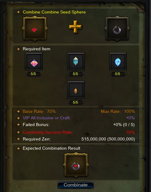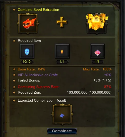 ⚠️É possível aumentar até 80% devido ao uso do VIP of Craft/All Inclusive. Se o upgrade for bem-sucedido, você recebe . Se falhar, você recupera seu Seed, os outros itens serão destruídos.